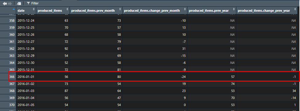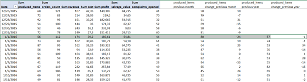 In this example, we can see that on the 1st of January 2016 56 items were produced while on the 1st of December 2015 it produced 80 items. This is a change in production by -24 items. The same logic applies to the year metric.